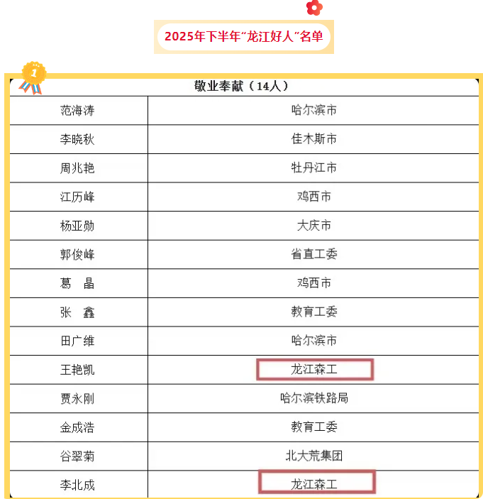 日前,黑龙江省文明办公布2025年下半年“龙江好人榜”,龙江LEHU88(中国)唯一官方网站集团李北成和王艳凯入选敬业奉献类“龙江好人”。
