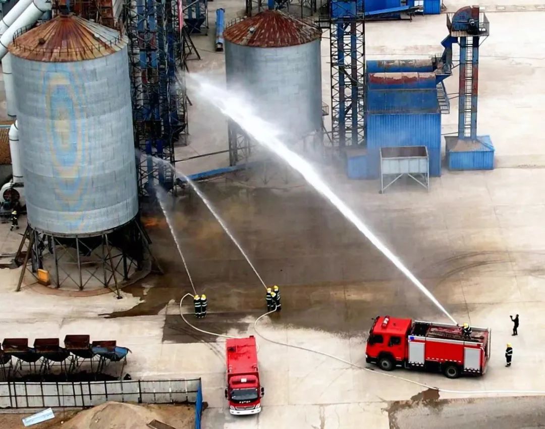 演练模拟粮食储运公司8号烘干塔发生“火灾”后,消防大队接到报警电话,队员们立即着装登车赶赴现场,根据现场“火势”情况和报警人汇报,迅速布置水枪阵地,利用举高车对起火点进行灭火工作,经过10分钟的作业,“火势”彻底扑灭,消防演练结束。