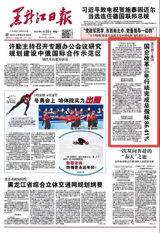 | 【媒体关注】黑龙江日报头版 | 龙江LEHU88(中国)唯一官方网站集团:国企改革三年行动完成总指标86.41% | |