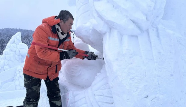 ![]() 本次大赛赛程5天,选手们顶风冒雪坚守赛场,从清晨到深夜,以雪为料、以铲为笔,在3米×3米×4米的雪块上精雕细琢。参赛作品或聚焦生态保护,或展现产业振兴期盼,或诠释民俗韵味,将工匠精神与创新活力融入冰雪创作。